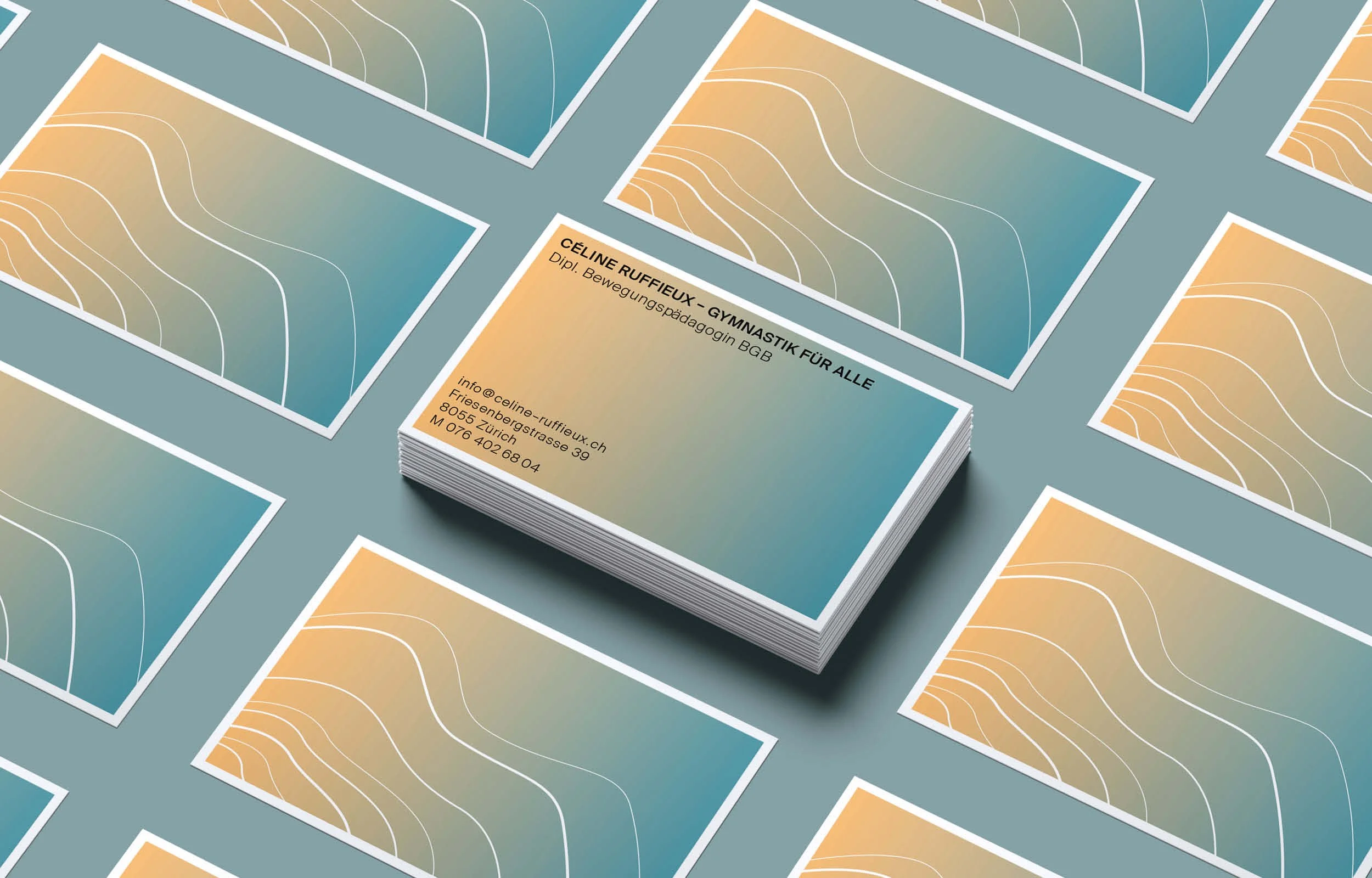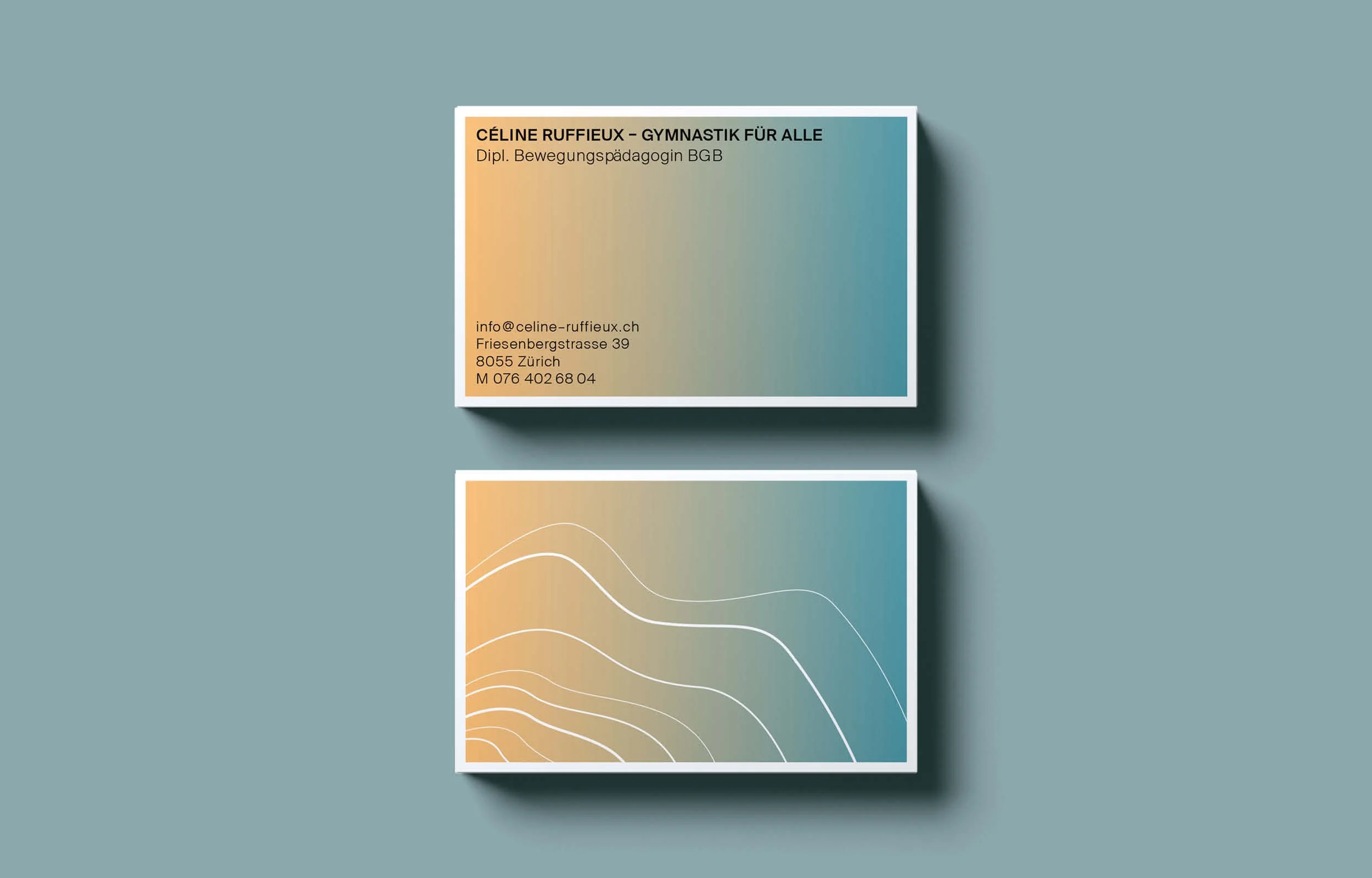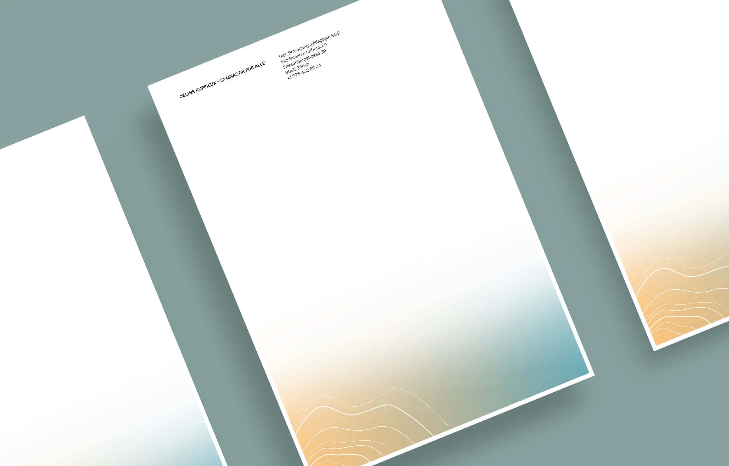 Céline Ruffieux BewegungstherapieNeues Erscheinungsbild, Visitenkarten, A5 Werbekarte, Briefpapier und Couvert.